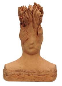 In der Serie „Köpfe“ sitzt der Kopf oft auf einem überdimensional langen Hals. Viele dieser Köpfe strecken sich nach oben, nach innen sehend, nach außen sehnend spürend, suchend…